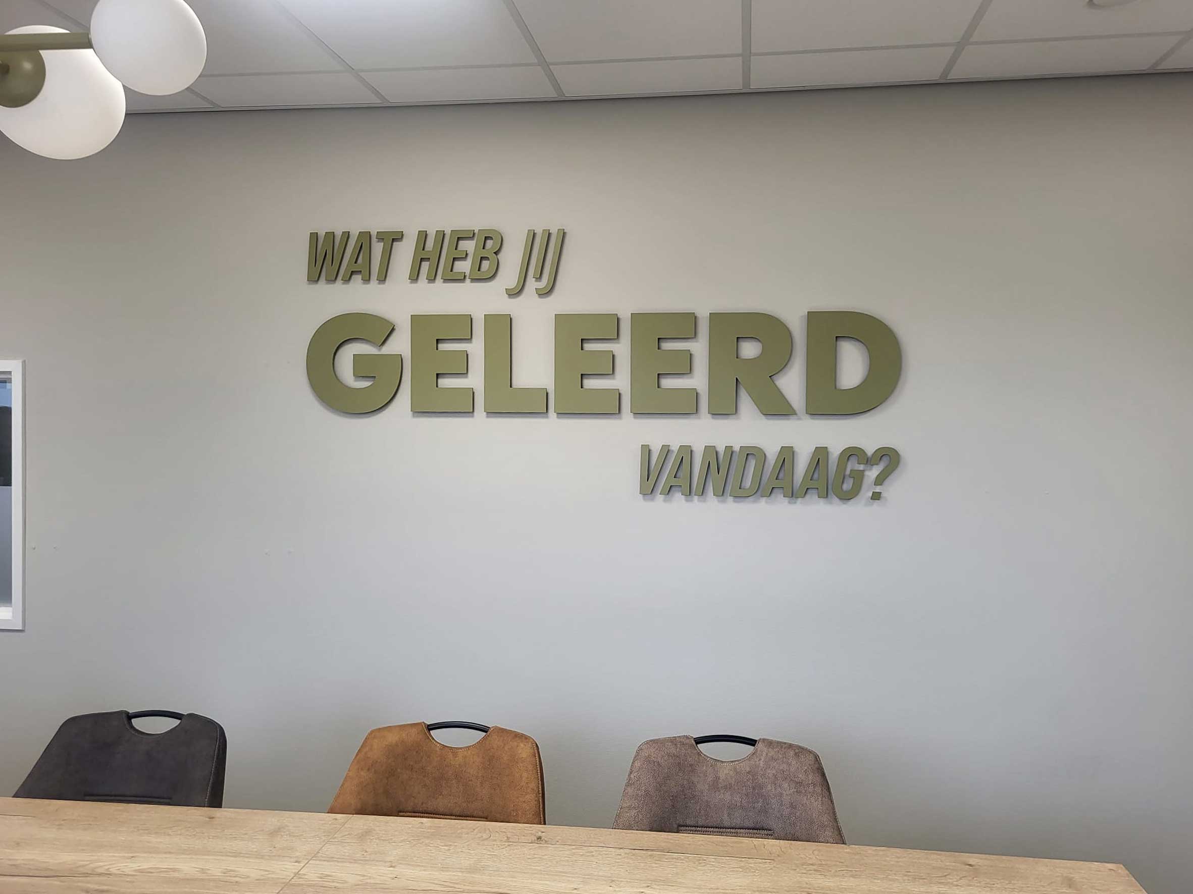In de cursusruimte van Aegolius hebben wij deze kunststof letters met afstand houders gemonteerd. Het is de eyecatcher van de ruimte geworden...